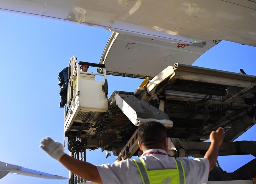 Staff were reloading cargo to a Cargolux Airlines International cargo plane at Zhengzhou Xinzheng International Airport in central China's Henan Province on Aug. 1, 2023. (Xinhua/Li Jianan)