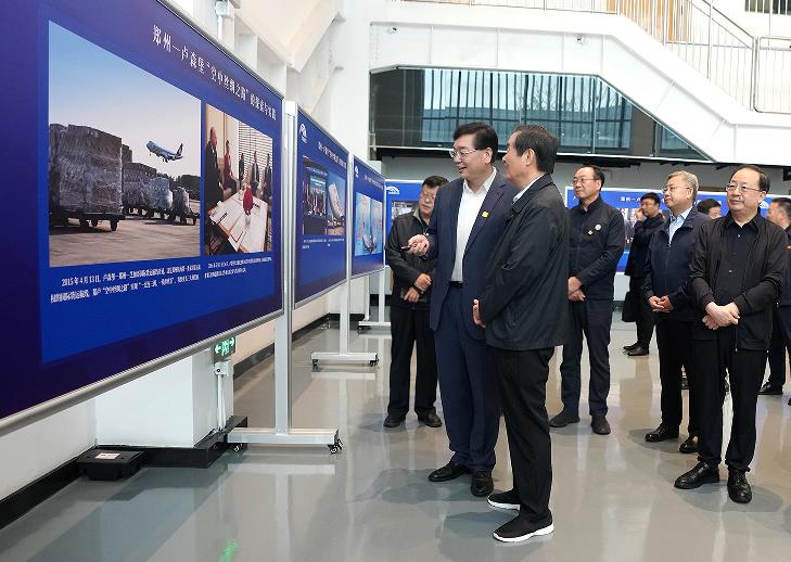 在位于鄭州航空港區(qū)的航投培訓中心,劉奇葆首先參觀了“鄭盧‘空中絲綢之路’的探索與實踐”圖片展。張明超詳細介紹了35張圖片背后的故事和內(nèi)涵,匯報了“一帶一路”框架下鄭盧“空中絲路”的建設歷程和發(fā)展現(xiàn)狀。