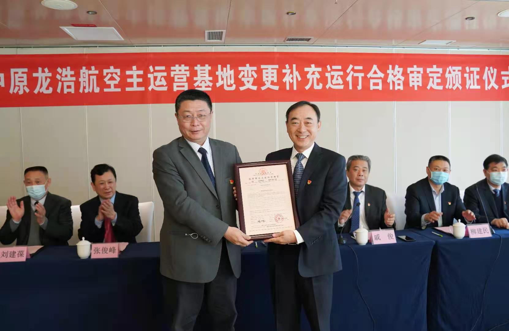 民航中南局向中原龍浩頒發(fā)主運營基地變更運行合格證