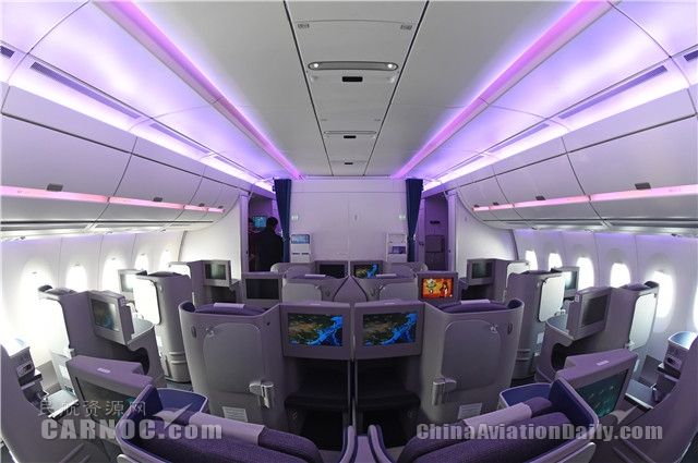 MSN2采用兩級(jí)客艙布局,商務(wù)艙擁有42個(gè)可全平躺的座位,經(jīng)濟(jì)艙擁有210個(gè)座位。A350樹(shù)立了最新的乘坐舒適性標(biāo)準(zhǔn),乘客無(wú)論身處哪個(gè)艙位,都可以獲得更大的個(gè)人空間。另外,A350客艙還擁有更大的舷窗、更大的頭頂行李艙,以及最新一代機(jī)上娛樂(lè)系統(tǒng)和空中上網(wǎng)功能。